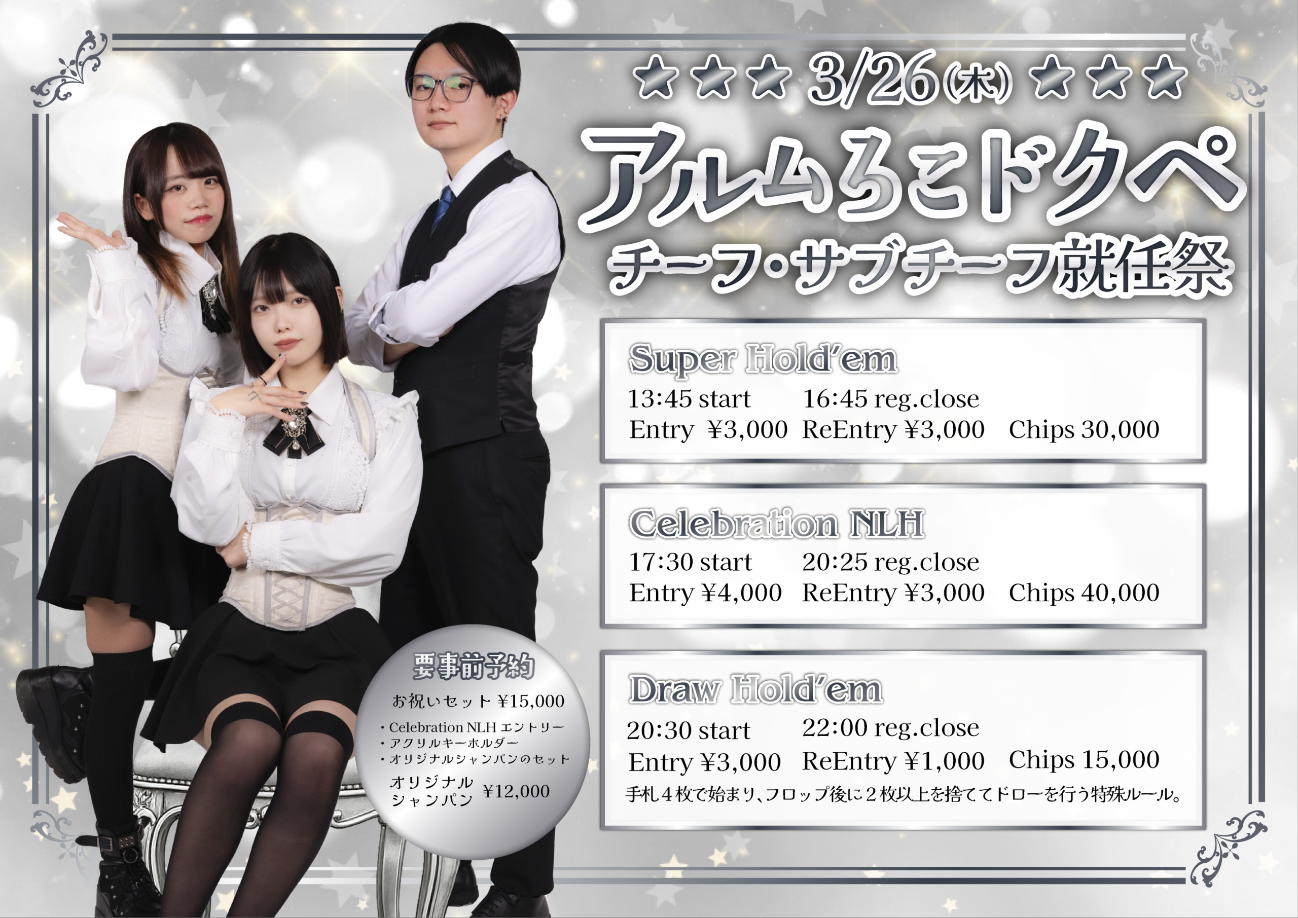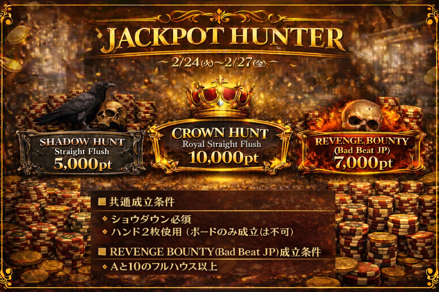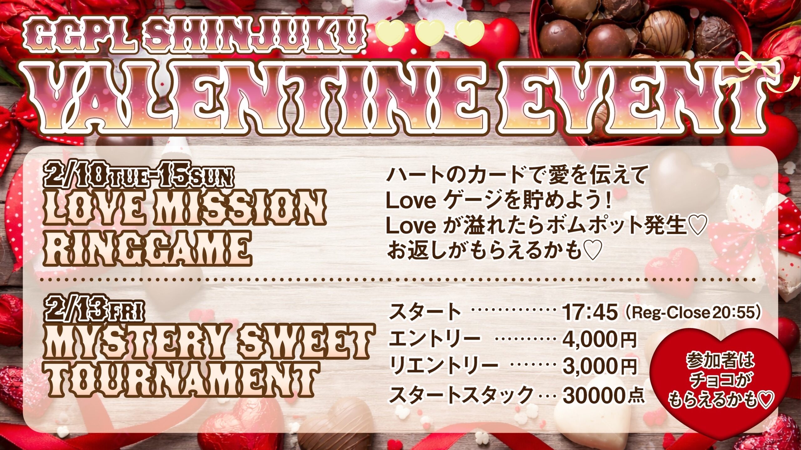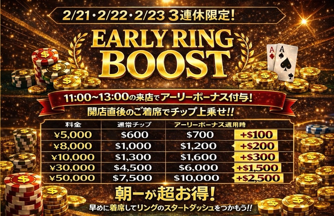 ポーカーで人生を変える、 そのはじまりは新宿から。 News NEWS 🎉 チーフ・サブチーフ就任祭 🎉 VIEW MORE 💎2/24(火)-2/27(金)JACKPOT HUNTER 開催💎 VIEW MORE ⚡2/21(土)〜2/23(月) EARLY RING BOOST⚡ VIEW MORE 🎀 GGPL新宿 Valentine Event 🎀 VIEW MORE « 前へ 1 2 3 4 … 17 次へ » ACCESS アクセス 所在地 〒160-0021 東京都新宿区歌舞伎町1-25-3 西武新宿駅前ビルWAMALL 3F 営業時間 月〜木 13:00-24:00 金 13:00-29:00 土 11:00-29:00 日・祝 11:00-24:00 アクセス 西武新宿駅より徒歩1分 採用情報 採用情報 GoodGame Poker Liveでは、ディーラー・フロアスタッフ問わず一緒に働いて頂ける方を現在募集しています。 採用情報はこちら 会社概要